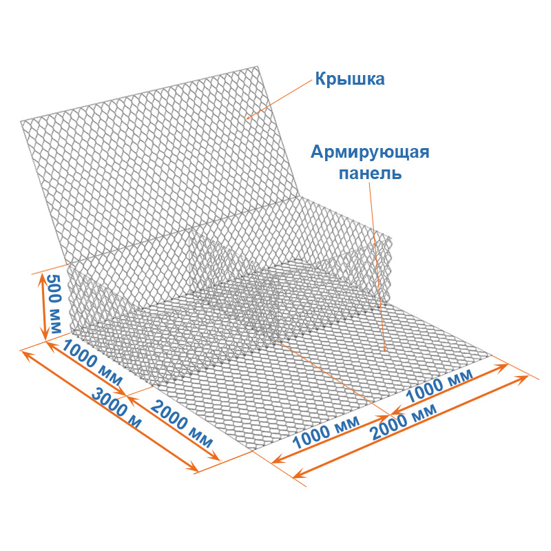 Габионы с армирующей панелью 3x2x0,5 представляют собой коробчатые габионы, нижняя сторона которых продлена и образует, так называемый, «хвост». Это и есть армопанель, которая составляет одно целое с одной из сторон конструкции.